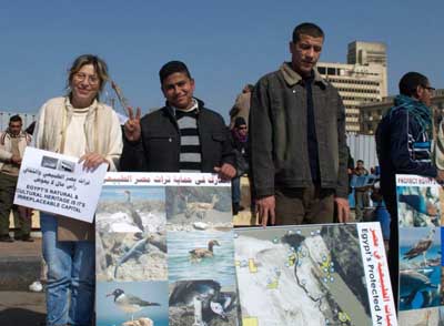 Dina Zulficar, Egyptian animal rights activist, writes, on the occasion of the first anniversary of the Egyptian Revolution, celebrated in Tahrir Square, “A banner, 30 meters long, illustrated the protected 29 areas of Egypt. We gave out many pamphlets with slogans, three big posters illustrating wildlife and a map showing the protected areas. People of many different ideologies responded. We ended up being joined by a great many supporters!