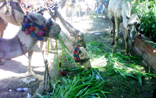 Camels having dinner.