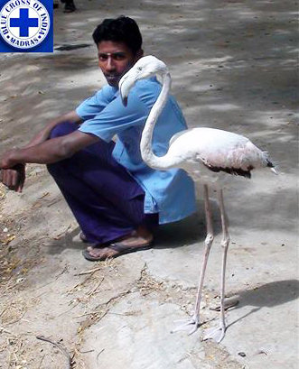 One of Blue Cross’s volunteers, Mr. Selva Kumaran, a student in AVIT College of Engineering, Mamallapuram, rescued a Greater Flamingo near a vacant plot at Ekkaduthangal and carried the bird, that had minor injuries, to the Velachery shelter.