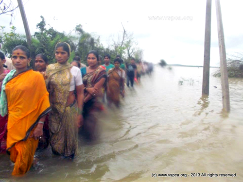 Our disaster response team is still hard at work conducting emergency rescue and relief efforts for the animals and people affected by cyclone Phailin and the flooding. The havoc didn’t end with the flooding, but another disaster in the form of incessant heavy rain due to low pressure across the Odisha coast since October 22, 2013 has brought flash floods to severely affected coastal districts. This has also hampered recovery and rescue efforts.