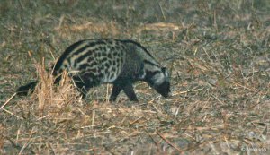 Although the population of this weasel relative is not officially endangered, they are difficult to observe. In addition to being nocturnal and solitary, they are prey to many African stalkers including leopards and lions. The species has also suffered from habitat loss. I have seen far more shining sets of civet eyes on nighttime safaris, than the actual animal.