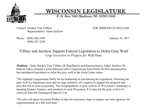 In the news from:Green Bay Press-Gazette Wisconsin senators Ron Johnson (R) and Tammy Baldwin (D) have joined Sen. Amy Klobuchar (D-Minn.) and Sen. John Barrasso (R-Wyo.) to introduce legislation that would remove protections for wolves in Wisconsin, Minnesota, Michigan and Wyoming under the federal Endangered Species Act.